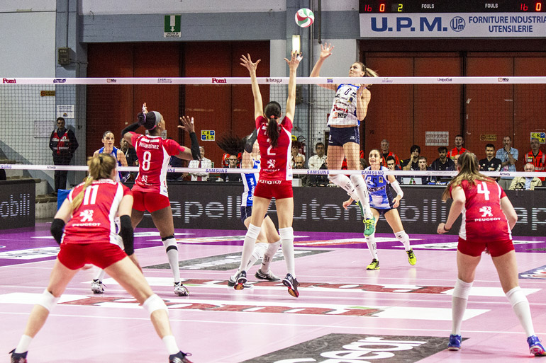 Nella ripresa è Busto a dimostrarsi più convinta e pericolosa, nonostante l’uscita di scena di Valentina Diouf per un malessere: mette subito la freccia e dà del filo da torcere alla formazione casalinga, che all’inizio fatica un po’ a trovare il ritmo in campo e lascia troppo spazio alle avversarie. Le ragazze di coach Caprara però non si lasciano intimorire e recuperano punto dopo punto, fino a riportarsi in pareggio sul 10-10. Il set procede punto a punto, ma sul finale la Pomì mostra segnali di cedimento, di cui Busto subito approfitta mettendo a segno qualche punto importante e riuscendo a sorpassare le rosa. Gli ultimi punti sono uno stillicidio, ma è la Pomì a mettere la parola Fine sul 27-25.