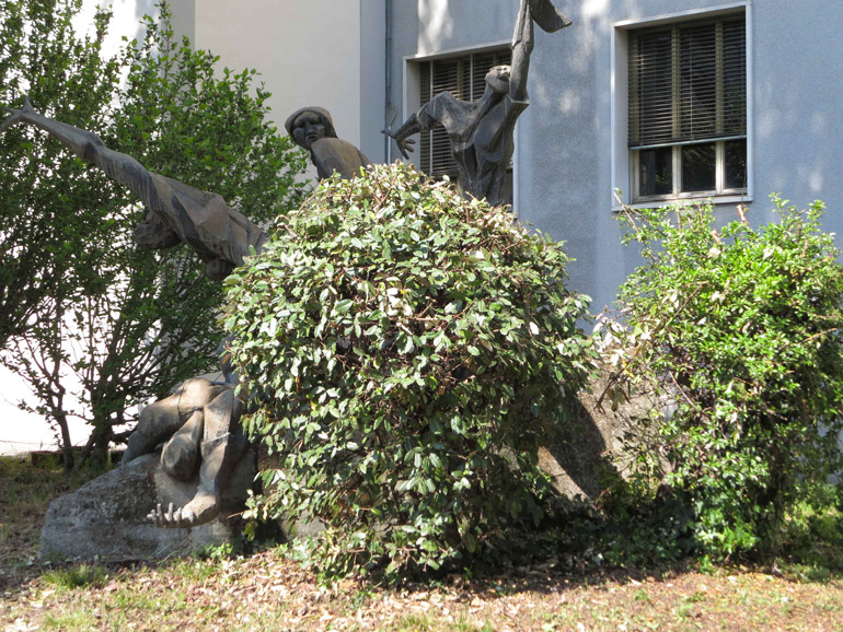 vorrei tornare sulla vicenda del monumento sito nel giardino della scuola media Virgilio: come si vede nella foto scattata il 29/4/17, dopo la richiesta cura di “liberazione”dal verde opprimente che lo nascondeva completamente, il risultato visibile a tutti è di non aver liberato un bel niente ed in compenso di aver deturpato anche i due cespugli.