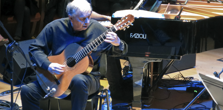 Al centro dell’ovale ha fatto quindi il suo ingresso Ralph Towner, storico componente degli “Oregon” con cui il quartetto ha inciso lo scorso anno il disco Duende, termine che indica un potere misterioso intraducibile con una sola parola, ma del quale il poeta García Lorca ha asserito: «Il duende non sta nella gola, sale interiormente dalla pianta dei piedi». Un po’ come gli assoli di chitarra di ieri, riverberati dal legno.
