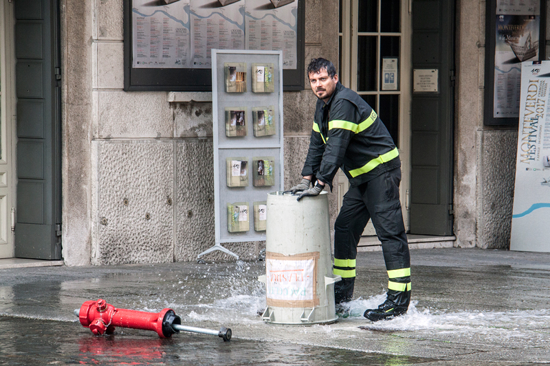 Furgoncino in manovra rompe un idrante, allagamento davanti al Ponchielli