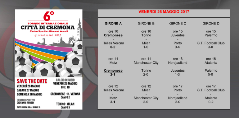 Prima del fischio d’inizio, un minuto di silenzio per le giovani vittime di Manchester, come richiesto dai dirigenti City, al primo anno di partecipazione al torneo cremonese. Poi il via alle prime due gare che hanno visto contrapposte Cremonese ed Hellas Verona da una parte, e Milan Manchester City dall’altra. Grigiorossi subito in svantaggio nei primi minuti: faticano a costruire gioco pressati dai gialloblù che trovano il raddoppio nel secondo tempo. Autore del primo gol dell’Hellas anche un piccolo figlio d’arte, il numero 10, è infatti Tommaso Ferrarese, figlio di Claudio che vestì la maglia grigiorossa per una stagione e mezza. Nella seconda gara del Gruppo A, la Cremonese non riesce a spuntarla nemmeno con il Metz, che vince per 2 reti a 1 (il gol grigiorosso porta la firma di Simone Panina), mentre il Verona batte i francesi e chiude a punteggio pieno. Si mette in evidenza il Milan nella prima partita dell’altro girone, vincendo contro il Manchester City per 2 a 0. Gli inglesi a loro volta vincono la seconda gara con il Torino per 2 a 0, mentre i granata battono il Milan di misura. Verona e Milan accedono direttamente ai quarti, seconde e terze affronteranno domattina gli ottavi.