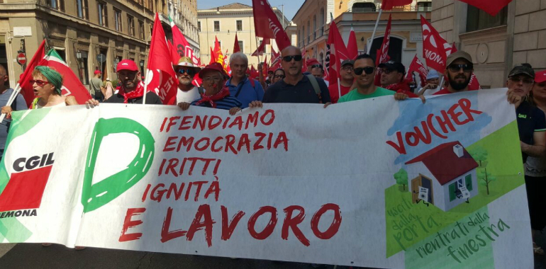 Contro la reintroduzione dei voucher, ora ridenominati ‘Libretto famiglia’ per le famiglie che offrono un lavoro occasionale accessorio e ‘Contratto di prestazione occasionale’ per gli altri committenti, la Cgil ha portato in piazza a Roma migliaia di persone. Folto anche il gruppo cremonese, partito con tre pullman delle categorie e dei pensionati e una trentina di metalmeccanici (in treno) della Fiom, tra cui l’ex segretario generale Mimmo Palmieri da poco passato alla guida dello Spi – pensionati e l’attuale Marco Pedretti. Per la Cgil, quella uscita dalla manovrina di aggiustamento dei conti pubblici passata alla Camera e al Senato con il voto di fiducia, è una soluzione insoddisfacente e viene considerata uno schiaffo alla democrazia compiuto dal governo e dalla politica che, dopo avere abrogato i voucher con un decreto legge, li avrebbe reintrodotti attraverso “un veicolo un po’ clandestino”.