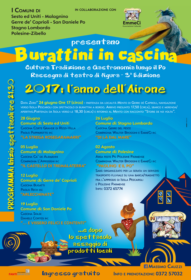 Visto il ripetersi del successo delle rassegne di burattini e le aspettative che tutti gli anni suscitano, si propone, per il terzo anno consecutivo, una rassegna di teatro di figura nelle cascine, per far conoscere ed ammirare le strutture architettoniche e sociali che hanno contenuto il lavoro, la vita e i sogni di migliaia di contadini non più tardi di sessant’anni or sono. I Comuni di Gerre de’ Caprioli, San Daniele Po, Stagno Lombardo, Malagnino, Sesto ed Uniti e Polesine-Zibello in collaborazione con EmmeCi-Associazione Culturale promuovono “Burattini in cascina, cultura, tradizione e gastronomia lungo il Po” 2017.