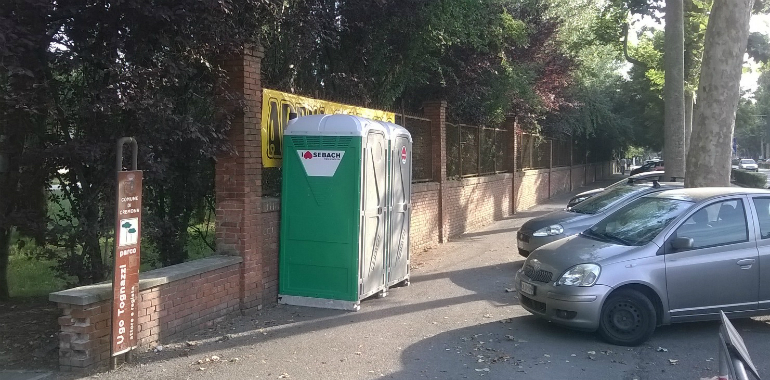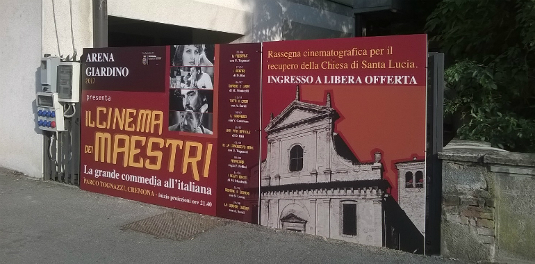 Oscurato dai gabinetti automatici. Lo striscione dell’Arena Giardino, appeso come ogni estate alla cancellata che delimita il parco Tognazzi – ex fornace di viale Po, è stato oscurato oggi dai servizi igienici in previsione del mercato della Fiera di San Pietro che si svolgerà nel fine settimana. Una collocazione infelice, considerando che il viale è lungo un km e che lo striscione giallo è l’unica insegna del cinema all’aperto.