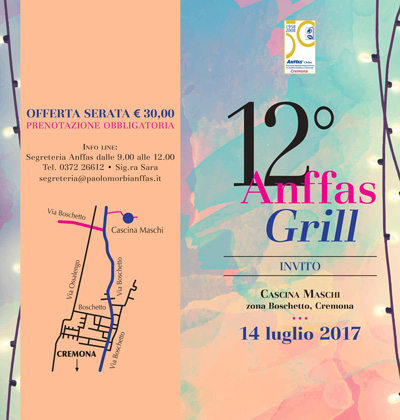 Nella serata di venerdì 14 luglio, dalle ore 20, alla Cascina Maschi, località Boschetto, si terrà la 12ª edizione dell’Anffas Grill, una cena benefica che ormai, è diventata un evento di riferimento nella città di Cremona.