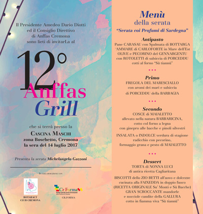 Il programma della serata prevede aperitivo e cena con prodotti tipici della cucina sarda, serviti dai ragazzi del Cr.Forma, del Rotaract Club Cremona e degli scout del CNGEI, mentre la colonna sonora della serata è affidata alle note del duo “Gianni e Cristiano”.