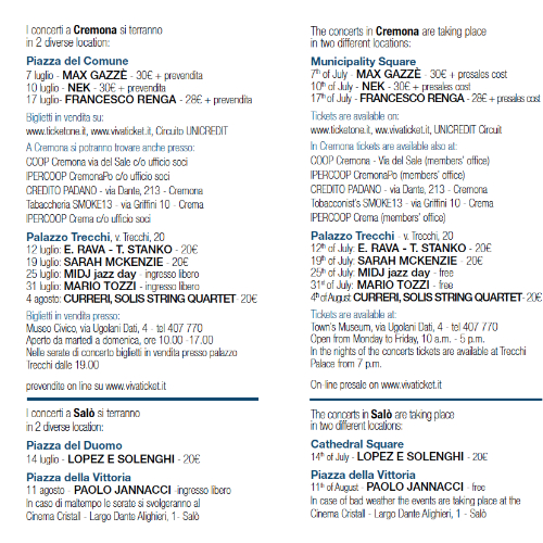 Il programma di Acquedotte prevede, dopo il concerto di questa sera di Renga, quattro altri appuntamenti a palazzo Trecchi: il jazz di Sarah Mckenzie il 19 luglio; il 25 luglio il MIDj jazz day; il 31 luglio incontro con Mario Tozzi e il 4 agosto chiusura della parte cremonese con il Solis String Quartet.