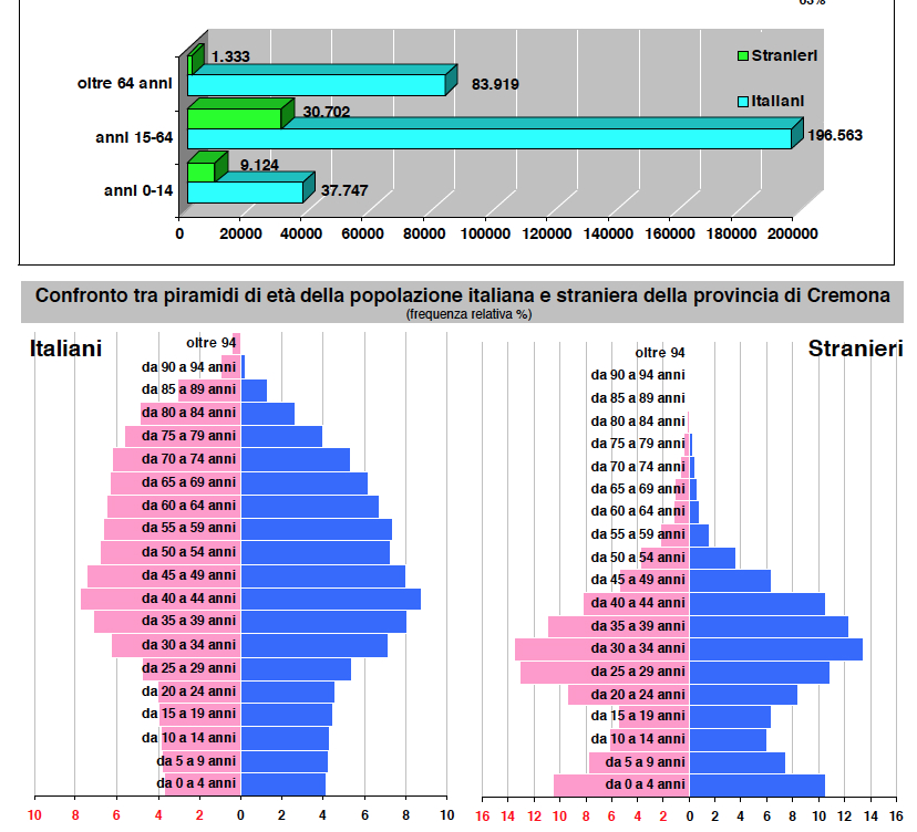 Una fotografia che preoccupa soprattutto se si raffrontano le piramidi dell’età, dove da anni si assiste ad un trend che le pubbliche amministrazioni guardano con molta preoccupazione perchè mostra come la popolazione in età lavorativa (e in quella giovanile) fra qualche anno non sarà in grado di mantenere quella anziana. 359.388 i residenti complessivi, 318.229 gli italiani, 41.159 gli stranieri. Ma la fascia anagrafica prevalente tra i primi è quella tra i 40 e i 59 anni, mentre le classi di età più corpose tra gli stranieri sono tra i nuovi nati (0-4 anni) e tra i 25 – 39enni.
