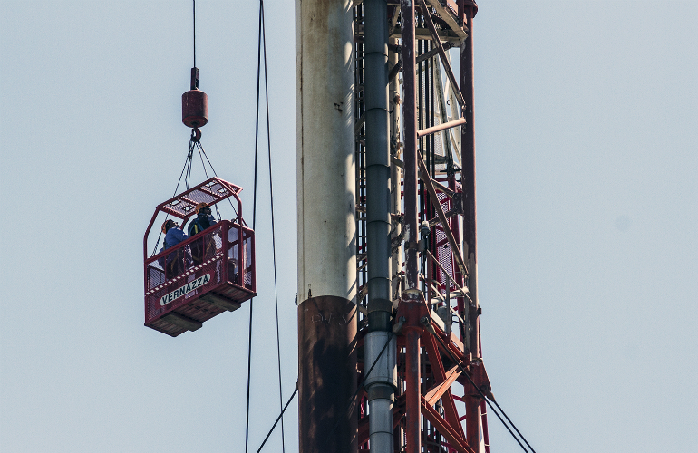 Una delle due autogru ha consentito agli operai incaricati di raggiungere i 130 metri che misura la torre più alta e di iniziare i lavori, sezionando la colonna della torre. Sulle fiaccole, già bonificate e sulle quali sono già state effettuate le prove gas-free, verranno effettuati tagli a caldo, la parte imbracata e tagliata verrà depositata a terra.