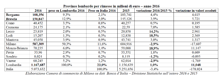 A livello regionale, la crescita delle rimesse rispetto allo scorso anno è pari all’1% (+11 milioni), toccando quasi gli 1,2 miliardi contro un dato che continua ad essere negativo in Italia (-3,4%). Complessivamente sono circa mille euro a testa che ogni immigrato invia ogni anno nel Paese di provenienza. Le rimesse lombarde pesano il 23% del totale italiano con Milano che è seconda a livello nazionale con 587 milioni di euro, 11,6%, superata solo da Roma (13,2%). Tra le prime dieci province italiane anche Brescia (sesta con 151 milioni di euro, 3% nazionale e +3,9% in un anno) e Bergamo (nona con 108 milioni di euro, +4,4%). E in anno crescono soprattutto le rimesse da Monza e Brianza e Lodi (+19% l’una) e Lecco (+14,2%). In rallentamento Milano e Varese (-2,9%) e Sondrio (-1,2%). Sono alcuni dei dati che emergono da un’elaborazione della Camera di commercio di Milano su dati registro delle imprese, Istat e World Bank 2016 e 2015 e dati Banca d’Italia, 2012-2016.