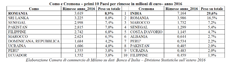 Guardando alla destinazione delle rimesse, a livello lombardo vanno soprattutto in Senegal quelle provenienti da Bergamo (18,1% delle rimesse totali dalla provincia) e Lecco (22,4%), in Pakistan da Brescia (13,9%) e Monza e Brianza (12%), in Romania da Como (8,9%), Lodi (20,8%), Pavia (17,7%) e Varese (9,9%), in India da Cremona (29,6%) e Mantova (23,5%), in Marocco da Sondrio (10,3%), nelle Filippine da Milano (15%).