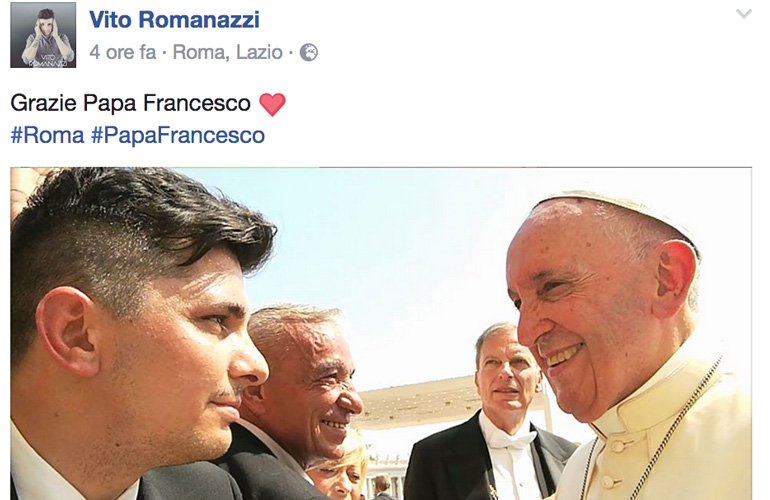E’ davvero un momento magico per Vito Romanazzi. Il cantante pugliese ma ormai cremonese d’adozione, vive un periodo di grande felicità. Sia sul piano professionale che personale. Dopo la finale del Festival di Castrocaro sabato sera trasmessa su RAI1, è arrivato ieri per lui l’incontro con Papa Francesco, all’udienza generale di Piazza San Pietro. Vito è molto credente: “Un’esperienza fantastica. Mi ha colpito il suo sguardo, quando mi ha guardato negli occhi ho sentito un’emozione grandissima. Anche in pochi attimi mi ha comunicato molto. Mi ha dato tanta nuova carica. E’ davvero un periodo fortunato per me. Non posso negarlo. Sono qui a Roma – racconta – perché ho cantato a Cinecittà Word durante gli eventi organizzati per le finali del concorso New Model Today International Contest, e poi da qui andrò in Puglia dove mi aspetta un altro concerto”.