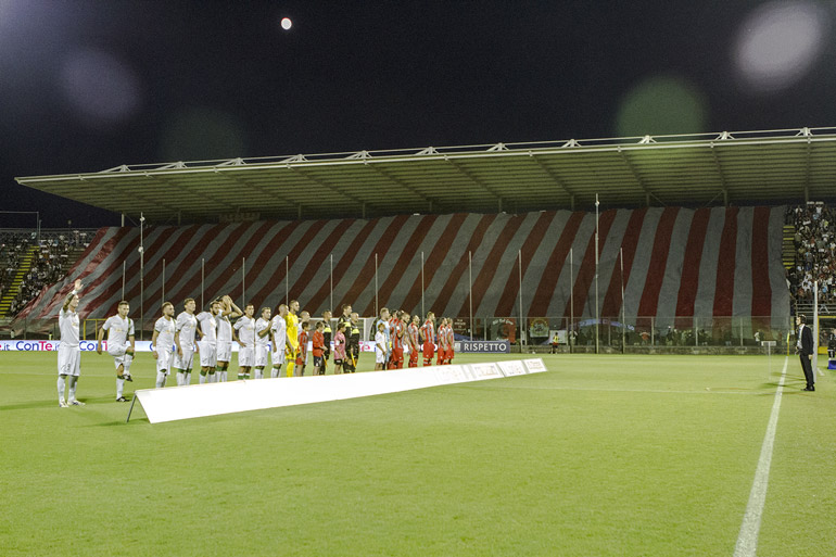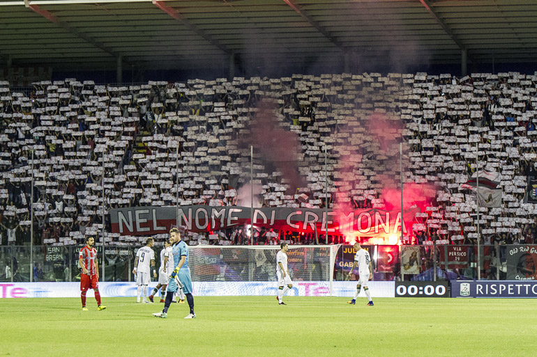Seconda giornata di campionato, per la Cremonese è la prima allo Zini, in uno stadio completamente rinnovato. La risposta dei tifosi è stata immediata in una sud gremita e festosa. All’ingresso delle squadre in campo la curva Erminio Favalli ha srotolato un bandierone grigiorosso che ha coperto tutta la curva e che poi ha lasciato il posto a centinaia di cartelli bianchi con scritto Cremona e uno striscione al centro che recitava “nel nome di Cremona”.