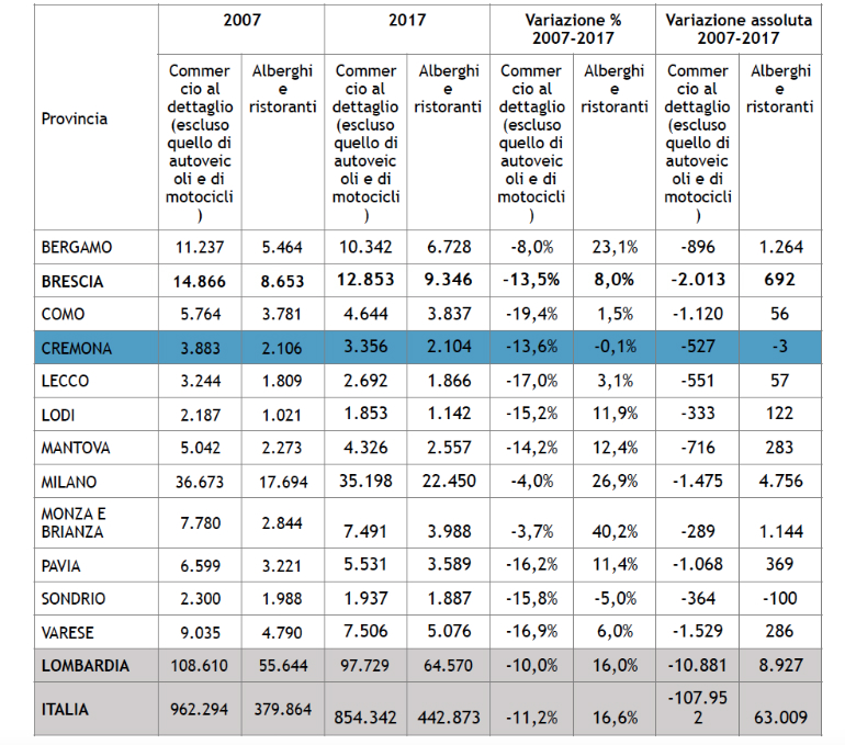 Meno commercio tradizionale e meno ristorazione e turismo. La grande recessione – scoppiata dieci anni fa – ha trasformato profondamente il volto delle città, modificando la composizione delle attività urbane e facendo spegnere le luci di molti negozi. Dal 2007 ad oggi, infatti in provincia di Cremona sono scomparse 530 imprese del commercio in sede fissa, il 13,6% del totale. Sul versante delle attività ricettive, che per altre realtà urbane invece stanno fungendo da volano per una ripresa, si assiste ad una diminuzione, che seppure minima (-0,1%) rappresenta fonte di preoccupazione. Infatti, rispetto al resto della Lombardia che complessivamente vede aumentare del 16% alberghi, B&B, bar e ristoranti, la provincia di Cremona è al palo. Una performace peggiore la raggiunge solo Sondrio (-5%).