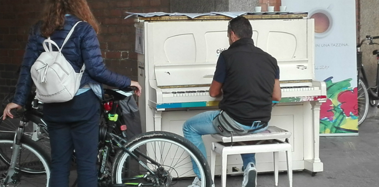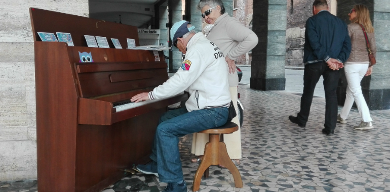 C’è anche chi si siede senza alcun timore reverenziale, non essendo nuovo ad esibirsi in pubblico al piano. Come il sindaco Galimberti che venerdì, affiancato da una giovane cantante lirica, ha suonato sotto i portici del Comune “Albachiara” di Vasco Rossi.