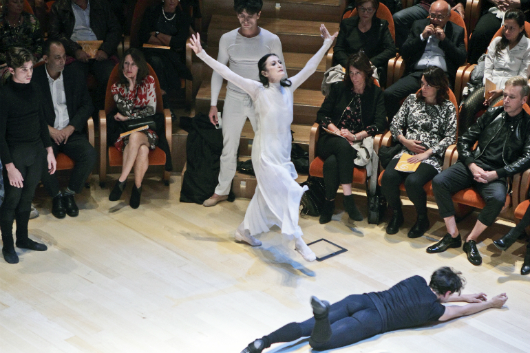 Un mito vivente della danza (Carla Fracci) e uno Stradivari dalla storia illustre (appartenne anche a Napoleone), fatto vibrare da una delle violiniste più virtuose dell’ultima generazione, Anna Tifu. Quanto basta per riempire l’auditorium Arvedi del Museo del Violino e trasformare una sala da concerti in un palcoscenico dove musica, suggestioni letterarie e balletto si intrecciano in un armonico insieme. Lo spettacolo ideato da Beppe Menegatti, “Omaggio a Stradivari” in prima assoluta per StradivariFestival è un mix di tanti elementi, su cui prevale la forte presenza scenica della Fracci, che a 81 anni dà ancora prova di eleganza e leggerezza, attorniata dai giovani ballerini della compagnia Dansepartout e dai primi ballerini Anbeta Toromani e Alessandro Macario. La poetessa Alda Merini, la cui esperienza esistenziale e poetica è alla base dello spettacolo, rivive in Carla Fracci che ora appare stizzita e impetuosa, ora fragile ed impaurita, sulle note di un’eccellente Anna Tifu, che spaziano da Bach a Berio, a Ysaye. Tre primedonne (Fracci, Tifu, Toromani) che dominano lo spazio scenico dell’ovale dell’auditorium, le cui dimensioni ristrette esaltano ancor di più la pregnanza dei gesti e delle espressioni sul viso della protagonista. Un concentrato di emozioni, al termine del quale il pubblico ha tributato un lungo applauso all’étoile e non solo.