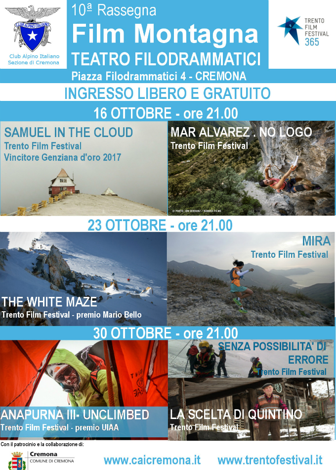 Lunedì 16 ottobre prende avvio presso il Cinema Teatro Filodrammatici, alle ore 21, la decima rassegna di film sul tema della montagna, organizzata dal CAI, Club Alpino Italiano – Sezione di Cremona, in collaborazione con il “Trento Film Festival” e con il patrocinio e la collaborazione del Comune. Le proiezioni sono aperte a tutta la cittadinanza e sono ad ingresso gratuito. Si inizia lunedì 16 ottobre con la proiezione del film Samuel in the clouds che quest‘anno ha vinto il premio Genziana d’oro al Trento Film Festivalcome miglior film quest’anno in concorso. La stessa sera sarà proiettato anche Mar Alvarez. NoLogo, breve storia di una delle più grandi donne dell’arrampicata mondiale.