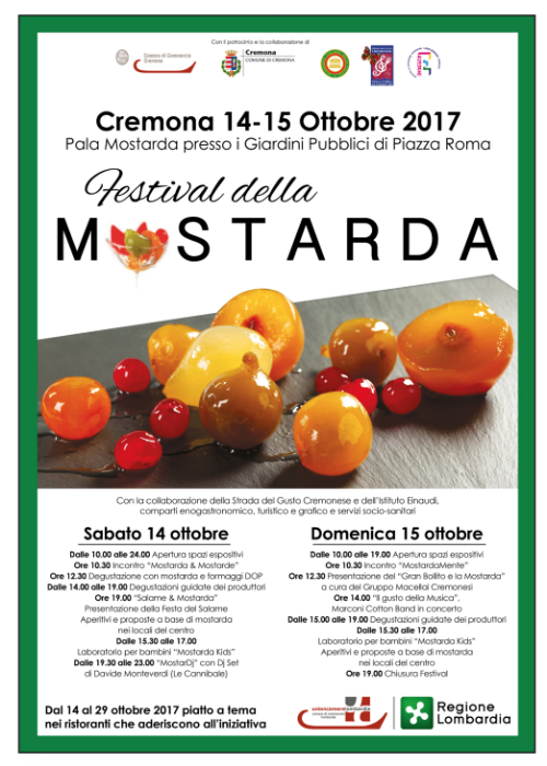 Inaugurato questa mattina in piazza Roma il Festival della Mostarda, nato dalla collaborazione tra Regione Lombardia, Unioncamere Lombardia e le Camere di Commercio di Cremona e di Mantova. Due giorni di incontri, degustazioni ed eventi culturali alla scoperta degli angoli più suggestivi delle due città lombarde, con la partecipazione di chef, produttori e critici gastronomici. Giunto ormai alla sua terza edizione, l’evento punta a celebrare tutte le sfumature di un prodotto tipico e al tempo stesso storico dell’Italia settentrionale, attraverso nuove interpretazioni culinarie della cucina contemporanea.? Per l’occasione, non mancheranno visite guidate, talk show, musica dal vivo e laboratori didattico-creativi dedicati ai bambini, oltre a numerose iniziative presso i ristoranti e i locali del territorio aderenti all’iniziativa.