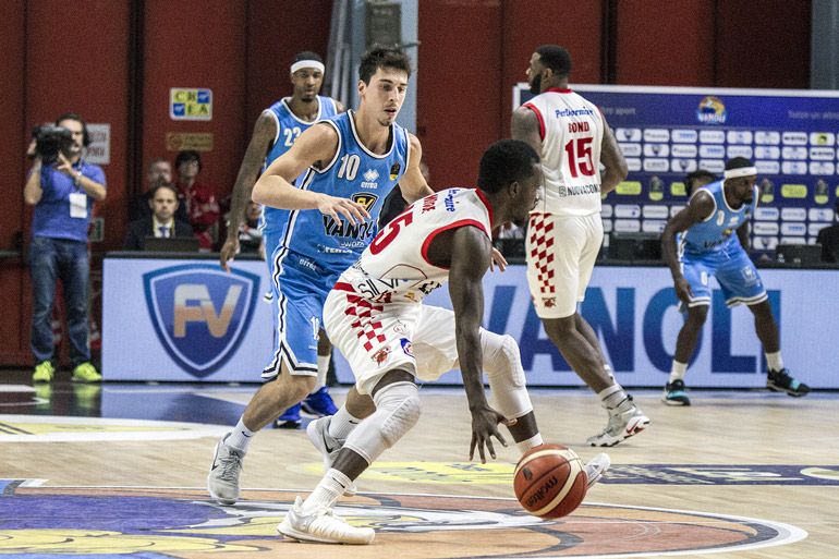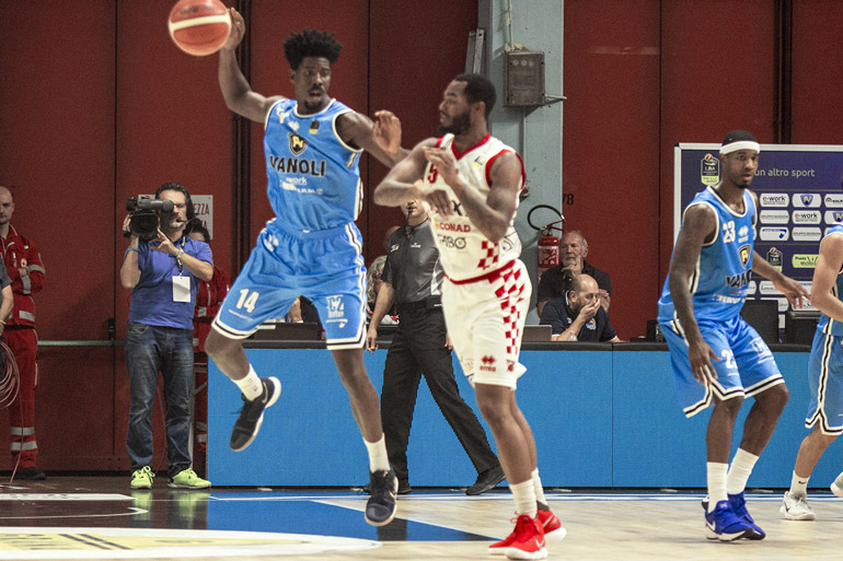 Il coach di casa cambia praticamente quintetto in campo ed è l’esperto Drake Diener a mettersi in luce portando avanti i suoi 25-18 ed una pregevole azione da tre punti di Ricci fissa il parziale al 10’ 31-18. Le due compagini si assomigliano molto in fatto di transizione con Cremona che la esegue meglio sul piano tattico. Sono l’americano Bond e l’ex Vanoli Gaspardo a tenere in corsa i pistoiesi sul 39-26 al 15’. Gli dà supporto Kennedy che trova varchi nella difesa cremonese ed il punteggio al 17’ è 39-34. Ci pensano Drake Diener (4 su 4 al tiro) e Johnson Odom a dare fiato e chiudere all’intervallo 47-40. Al rientro dagli spogliatoi Moore in cabina di regia distribuisce assist in attacco e gli ospiti si portano 47-45. E’ parità con una tripla di Mian al 23’ 50-50. Le due squadre ribattono colpo su colpo. Coach Esposito si arrabbia molto in un time-out quando la Vanoli prova a scappare sul 56-52 ma non ha gli effetti sperati perché i biancoazzurri con la regia di Travis Diener e le realizzazioni del cugino Drake allungano il margine di stacco a più 10 sul 68-58 al 28’. Al 30’ 72-60 con Pistoia che perde ben 18 palloni (solo 9 dalla vanoli).
