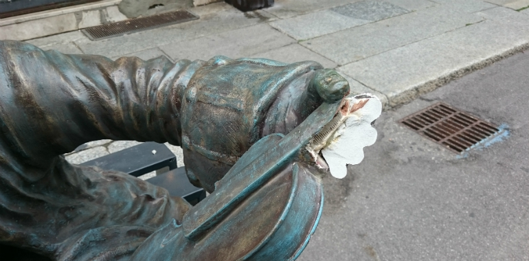 Dopo innumerevoli episodi vandalici, la sfortunata statua aveva vissuto un periodo relativamente tranquillo, finché, lo scorso 3 ottobre, un camion di grandi dimensioni, durante una manovra, aveva urtato il manufatto, provocando il distacco sia del manico del violino che di una parte delle dita, nonchè la rottura del pollice. Il conducente non si era fermato, ma era stato poi individuato dall’esame delle telecamere di videosorveglianza, che avevano ripreso l’azzardata manovra.
