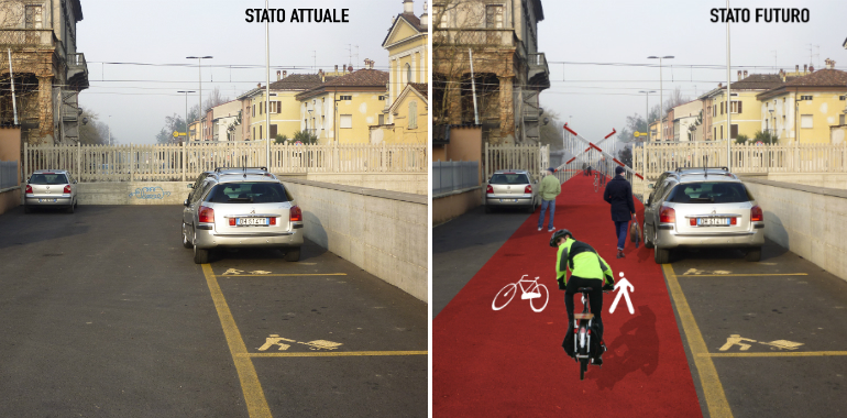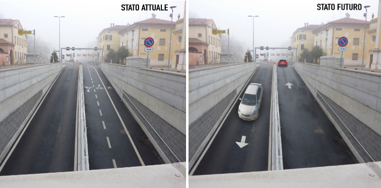 L’elaborato prevede di lasciare il doppio senso di marcia nel sottopasso e di realizzare una pista ciclabile e pedonale a raso accanto al sottopasso, dove già c’è una strada ampia e asfaltata e quindi pronta per l’uso, con l’attraversamento della linea ferroviaria mediante un passaggio a livello ad hoc, con semplici sbarre realizzate nel pieno rispetto delle norme di sicurezza (semafori, sbarre cieche che chiudono sia i binari che le piste nei momenti opportuni), si legge nel progetto.