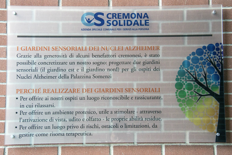 E’ stato realizzato grazie alla donazione della famiglia Acerbi, il primo giardino sensoriale destinato ai malati di Alzheimer, presso la palazzina Somenzi di Cremona Solidale. Oggi, la prima presentazione pubblica della struttura che sorge fuori dall’ala est della palazzina, alla presenza della progettista, architetto Patrizia Villa, del sindaco Gianluca Galimberti, e dell’assessore Rosita Viola, del presidente di Cremona Solidale Emilio Arcaini e di Fondazione Città di Cremona Uliana Garoli. Si tratta del primo spazio esterno destinato ai malati che progressivamente perdono contatto con la realtà esterna; un secondo percorso verrà realizzato sul versante nord dell’edificio. Un progetto semplice, ma accuratamente studiato con accorgimenti finalizzati a migliorare le condizioni di vita dei malati. Il percorso costituisce il naturale proseguimento esterno dell’area soggiorno nell’ala est. Quello che era un semplice prato verde è stato in parte ricoperto da una pedana in listoni di legno che si prolungano fino ad arrivare alle quattro poltrone per la seduta. Il colore giallo del passamano consente a pazienti di camminare con una certa autonomia (nella progressiva perdita sensoriale il colore giallo è quello che vedono più a lungo nel tempo); l’importanza dei colori viene mantenuta anche nelle essenze floreali, passando dalle gradazioni del rosa, del giallo, del violetto. Variano i piani di calpestìo, dalla rigidità del legno al morbido dell’erba e l’andamento ondulato della rete di recinzione dà l’idea dell’apertura verso il mondo esterno. Quello che è stato creato è “un luogo riconoscibile e rassicurante, in cui rilassarsi, utile a stimolare attraverso l’attivazione di vista, udito e olfatto, le abilità residue, da gestire come risorsa terapeutica”.