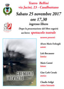 Sabato 25 novembre, alle ore 17.30 presso il teatro Bellini di Casalbuttano verrà presentato il libro ‘Cremona-Treviglio la strada ferrata’, di Alvaro Mario Ferlenghi, già presidente, per 14 anni, del Circolo Fotografico del Dopolavoro ferroviario di Cremona nonché co-autore del volume ‘La Stazione di Cremona 1863-2011’ insieme a Gianluigi Boldori e Giuseppe Ghisolfi. Durante la serata, verranno lette alcune poesie dialettali e si potrà assistere a un breve spettacolo teatrale a tema ferroviario a cura dalla compagnia teatrale ‘Il Canovaccio’ di Cremona.