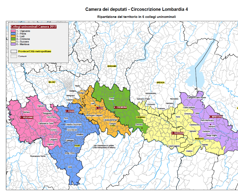 Beato chi si orienta. La difficoltà nel mettere insieme i nominativi per le liste che si sfideranno alle Politiche rispecchia non solo la legge elettorale ma anche le diverse consistenze territoriali dei collegi. Diverse a seconda si prendano in considerazione Camera dei Deputati o Senato, ciascuna delle due aule a sua volta suddivisa tra quota proporzionale (liste plurinominali) e maggioritaria (liste uninominali). Prendiamo il Senato, quota plurinominale, ad esempio. Mentre cinque anni fa il capoluogo Cremona faceva parte dell’unica circoscrizione Lombardia, in questa tornata figura nel collegio Lombardia 01, in cui vengono attribuiti 5 seggi complessivamente e che copre un’area territoriale comprendente le intere province di Pavia, Lodi, Cremona e Mantova, 11 comuni della città metropolitana di Milano e 10 comuni della provincia di Brescia. Se invece si guarda all’uninominale del Senato, scopriamo una dimensione territoriale più parcellizzata: il capoluogo Cremona fa parte del collegio Lombardia 17, insieme a Crema e ad una cinquantina di comuni da Spinadesco a Rivolta d’Adda; tutta la parte orientale della provincia, da Bonemerse a Rivarolo del Re, fa parte del Lombardia 18.