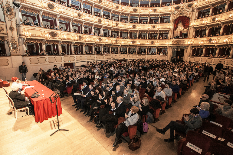 Dopo la presentazione di Ilde Bottoli, del sottosegretario alla presidenza del Consiglio Luciano Pizzetti e del sindaco Gianluca Galimberti, la Segre ha subito chiarito di essere qui “per i miei nipoti ideali di oggi. Ho una storia da raccontarvi, una storia tragica che però finisce bene”.