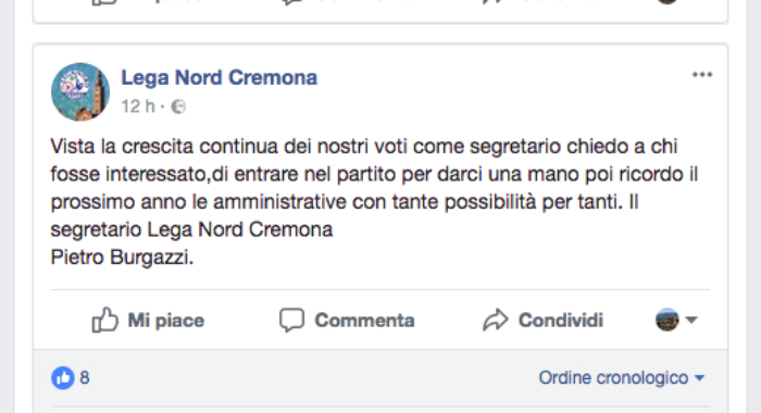 Cercasi attivisti per la Lega Nord. Il clamoroso risultato del partito di Salvini a Cremona potrebbe creare qualche imbarazzo tra le fila dei leghisti, soprattutto in città, dove la sede cittadina non è mai stata particolarmente folta. E difatti il segretario cittadino Pietro Burgazzi lancia l’appello dalla pagina facebook del partito: “Vista la crescita continua dei nostri voti come segretario chiedo a chi fosse interessato, di entrare nel partito per darci una mano poi ricordo il prossimo anno le amministrative con tante possibilità per tanti. Il segretario Lega Nord Cremona, Pietro Burgazzi”.