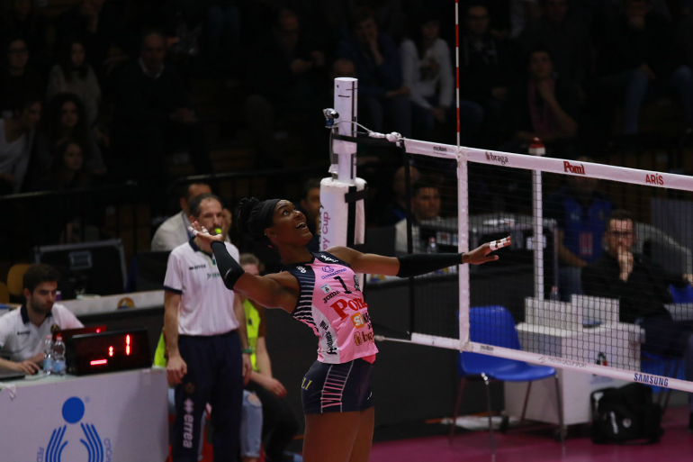 Secondo set. Nella seconda frazione coach Fenoglio parte con Montano al posto di Mingardi. Ace di Caterina Bosetti che beffa Martinez, 3-2 Modena. Martinez si fa perdonare poco dopo, sfrutta il piano del muro bianco nero e fa 3-4 e il muro di Guiggi rimette tutto in parità 4-4. Alzata ad una mano di Lo Bianco e Guiggi ancora, in fast, pareggia nuovamente i conti 5-5. Montano termina un bellissimo scambio che ha visto un salvataggio di Leonardi nel campo avversario, 7-7, ma Martinez riporta avanti le rosa 8-7. Bella parallela di Drews, 11-9, e Guiggi allunga 12-9. Grothues trova un buco nella difesa ospite e sigla il 14-11, time out per coach Fenoglio. Heyrman stacca ad un piede e mette a terra il pallone del 13-15, sulla successiva battuta Montano trova un ace fortunoso ma efficace, 14-15, ma Martinez allunga. Drews imbocca il canale giusto e sigla in diagonale il punto del 18-15. Muro “fotografia” di Stevanovic su Heyrman e 20-17 Pomì. Brayelin Martinez chiude il secondo set 25-20. Top Scorer: Martinez e Stevanovic 4, Montano 5.