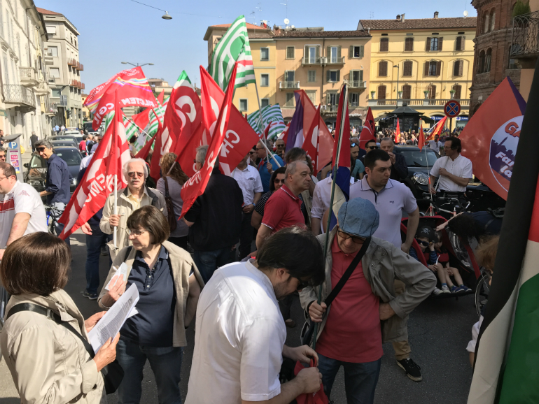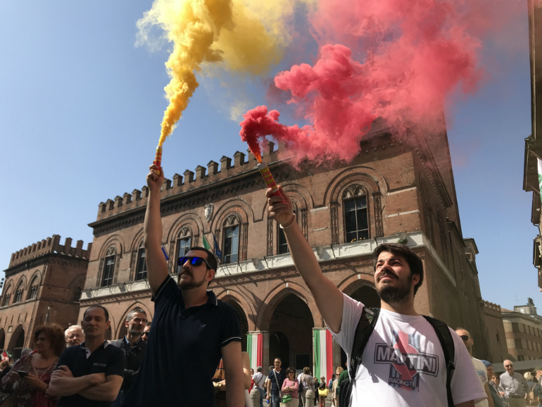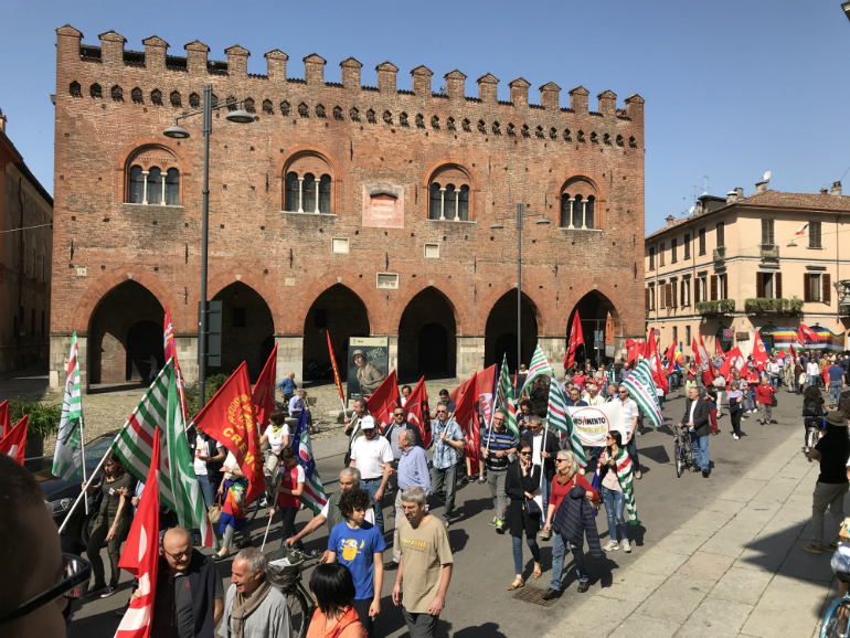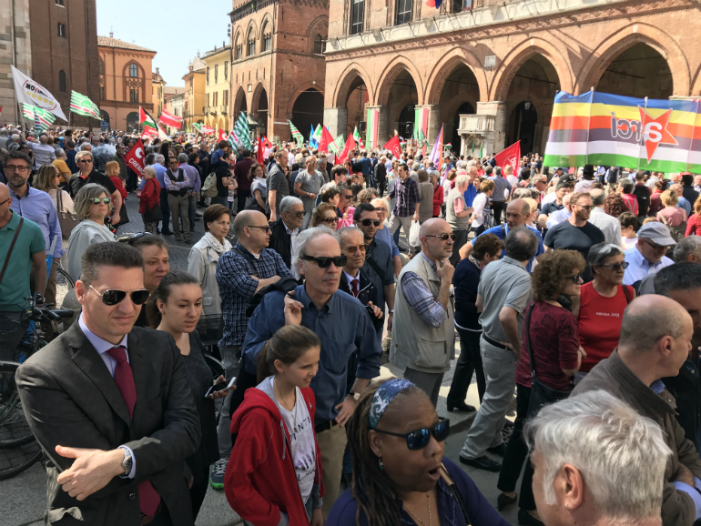 Era iniziata già dalla notte precedente, la preparazione della manifestazione del 25 aprile, con il presidio da parte delle forze dell’ordine di alcune sedi politiche cittadine, come quella del Pd, quella della Lega e quella di CasaPound, per scongiurare eventuali azioni di protesta. Ma massiccia è la presenza di forze dell’ordine anche all’apertura del corteo, che da San Luca ha preso il via intorno alle 10.15 alla presenza di tutte le autorità cittadine: la Giunta comunale al completo, una rappresentanza del Consiglio comunale, nonché diversi esponenti del mondo politico cittadino, tra cui Luciano Pizzetti. Presenti le delegazioni delle sigle sindacali e del csa Dordoni; questi hanno espresso il proprio disappunto nei confronti della Barilla, per il recente incontro dell’a.d. con il leader turco Erdogan.