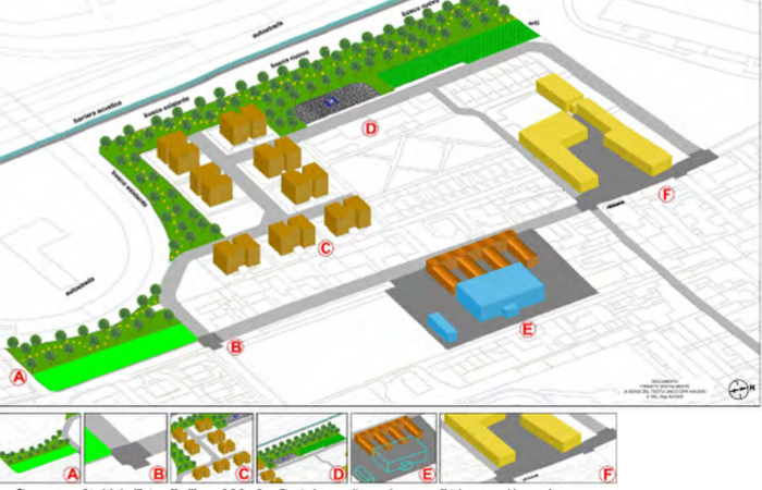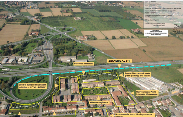 – implementazione delle attuali aree verdi con la creazione di un bosco filtro a ridosso dell’autostrada, di percorsi pedonali attrezzati e di ulteriori orti sociali.