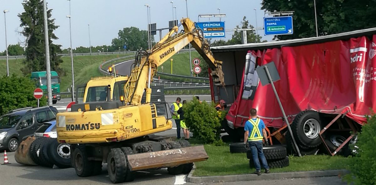 Camion perde il controllo nello svincolo per l'A21, Si rovescia carico di gomme