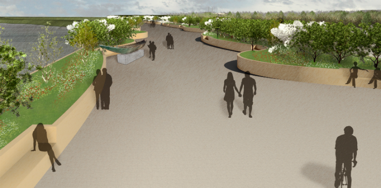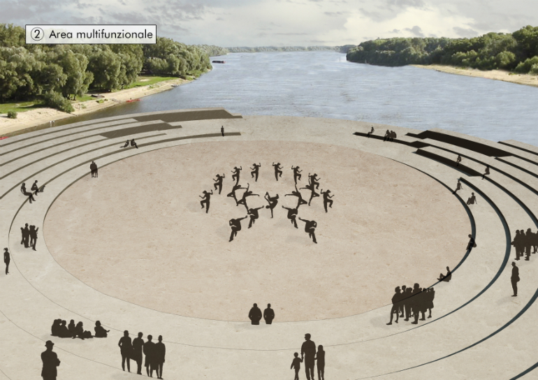 Sarebbe altresì necessaria una riqualificazione del “pennello” tramite la realizzazione di una passeggiata che sarebbe la prosecuzione di quella del Lungo Po Europa. La passeggiata è caratterizzata da vari belvedere affaccianti sul porto e dall’andamento sinuoso della panchina. La quale definisce anche il percorso pedonale che si sviluppa sul pennello. All’apice del “pennello” il progetto prevede la realizzazione di una piazza circolare sull’acqua, con gradoni concentrici come belvedere sul fiume.