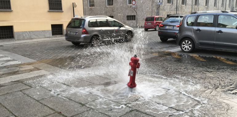 Un'auto urta l'idrante davanti al teatro. Strada allagata dal potente flusso d'acqua