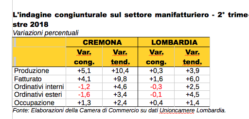 Drastica riduzione delle esportazioni nel secondo trimestre del 2018, secondo le rilevazioni della Camera di Commercio. I dati congiunturali sul comparto industriale manifatturiero cremonese sono ampiamente positivi per quanto riguarda la produzione, il fatturato e l’occupazione, ma segnalano un’inversione di tendenza di segno negativo negli indicatori relativi alla domanda, sia nazionale che estera. Si mantengono ampiamente positivi i confronti con lo stesso periodo del 2017 di tutte le variabili investigate, anche se, coerentemente col dato congiunturale, rallenta il ritmo di crescita degli ordinativi.