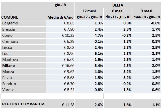 Come per il comparto delle vendite anche in quello delle locazioni il trend è positivo, con un incoraggiante +1,6%. Sei dei 12 capoluoghi di provincia sono in netta ripresa con oscillazioni a segno più che superano i due punti percentuali: i prezzi di Pavia e Monza salgono del 3,2%, seguono Lecco e Lodi con +2,8%, Brescia con +2,5% e Milano +2,3%. Milano si conferma la più cara, con un prezzo al metro quadro di oltre 5 euro superiore alla media regionale: qui per affittare un bilocale di 60 mq servono 1.000 euro al mese. A Cremona, il capoluogo più economico anche per quanto riguarda le locazioni, ne bastano 377. Anche a livello di media euro al metro quadro, a Cremona ne servono infatti 6.29, appena davanti a Mantova (6.69) e Sondrio (6.70).