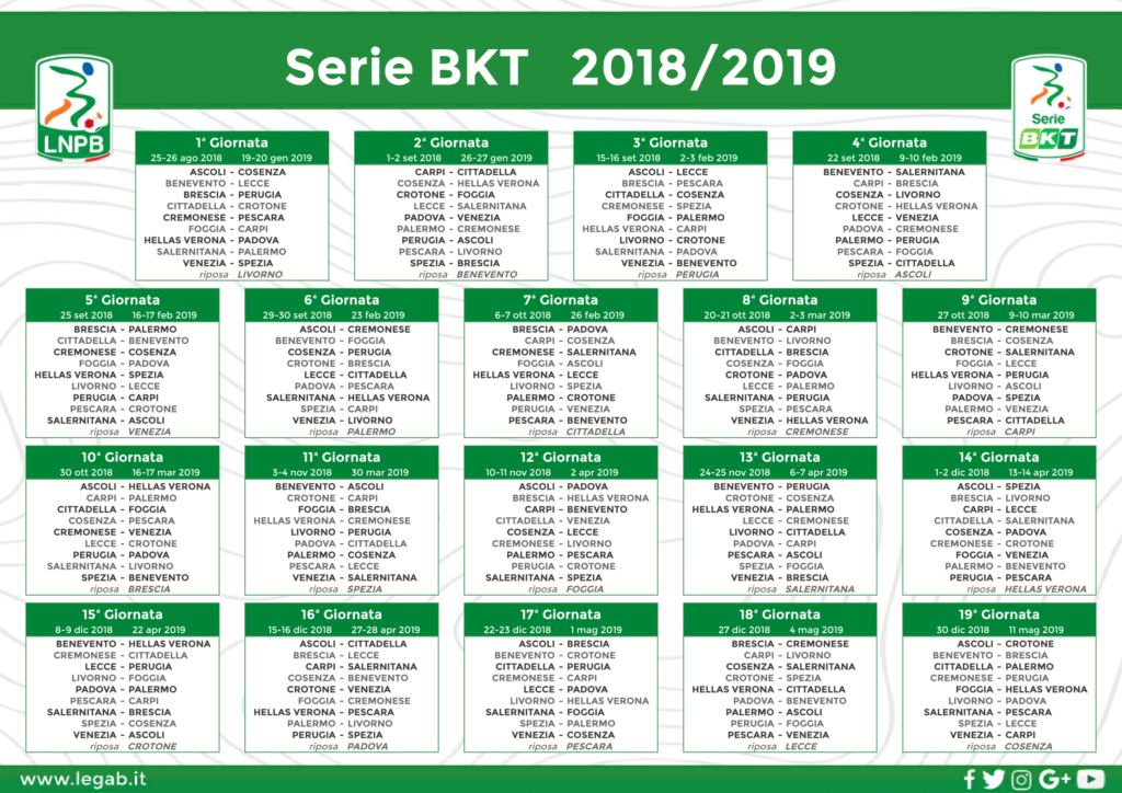 E quindi? Una squadra riposa, l’anticipo si giocherà il venerdì alle ore 21, tre gare si disputeranno alle ore 15 di sabato, una alle 18, due di domenica alle 15 e un’altra sempre di domenica alle 21. Infine il posticipo del lunedì rimarrà alle 21. Si giocherà nei giorni festivi di lunedì 22 aprile (Pasquetta) e di mercoledì 1 maggio. Confermato il format natalizio: 23 e 30 dicembre in campo, con il turno infrasettimanale di giovedì 27 dicembre. Gli altri (5 in totale) saranno martedì 25 settembre, martedì 30 ottobre, martedì 26 febbraio e martedì 2 aprile. La sosta invernale è invece prevista dal 31 dicembre al 19 gennaio 2019. Confermato infine anche il numero di promozioni e retrocessioni: rimarranno rispettivamente tre e quattro.