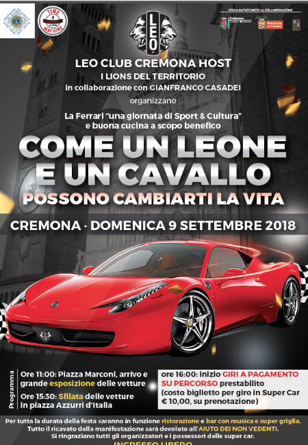 Domenica 9 settembre il Leo club Cremona Host in collaborazione con i Lions club del territorio e Gianfranco Casadei organizza la manifestazione benefica “Come un leone e un cavallo possono cambiarti la vita” per una raccolta fondi che consentirà l’acquisto di un cane guida per non vedenti e bastoni sonar per persone con disabilità visiva. Protagoniste saranno le Rosse di Maranello, che stazioneranno in piazza Marconi tra le 11.30 e le 15.