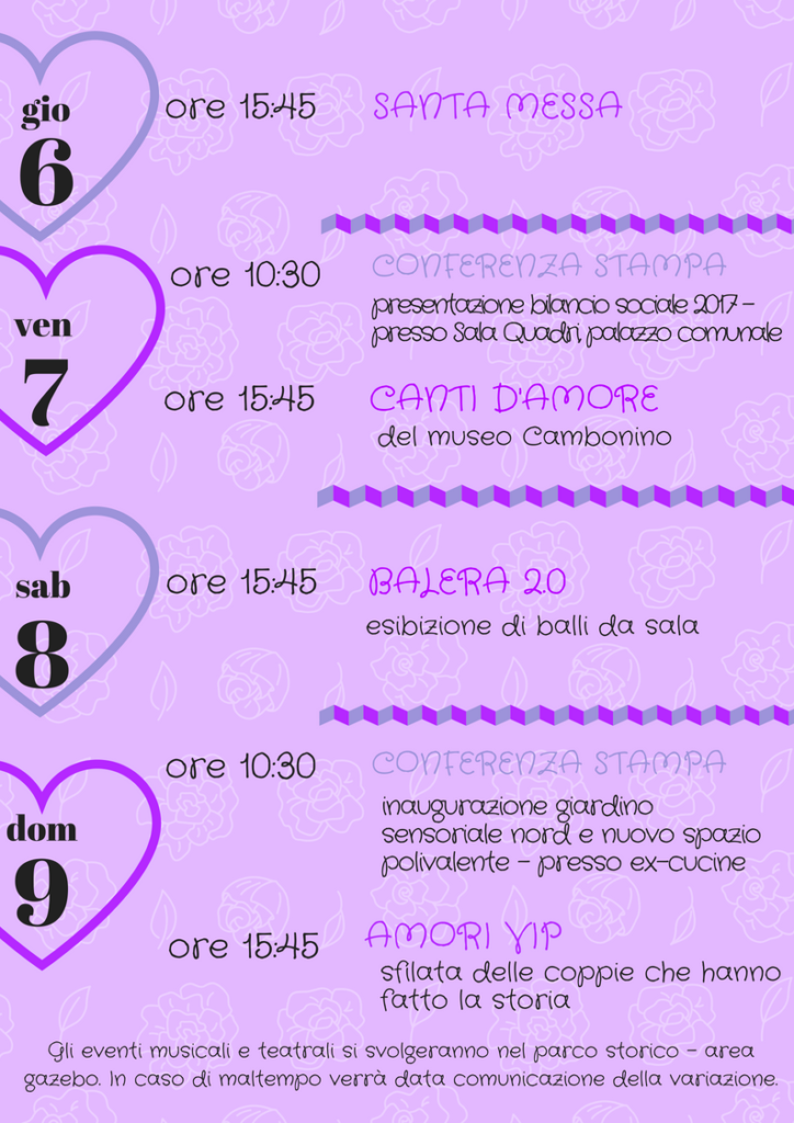 Si aprirà questo pomeriggio, giovedì 6 settembre, alle 15.45 con la Santa Messa la Sagra Settembrina di Cremona Solidale. Una serie di appuntamenti che terranno compagnia agli ospiti fino a domenica 9 comrpesa, quando all’interno della struttura ci sarà la sfilata delle coppie che hanno fatto la storia. La degna conclusione di un percorso strettamente legato al tema dell’amore, scelto quest’anno dagli organizzatori: dalle canzoni d’amore, appunto, ai balli da Balera, dove molti anziani si sono conosciuti in gioventù. La Sagra sarà infine l’occasione per presentare il bilancio sociale 2017 (presso la Sala Quadri di Palazzo Comunale, ndr) e per l’inaugurazione del giardino sensoriale nord e del nuovo spazio polivalente presso le ex cucine (leggi qui: Nuovi spazi a Cremona Solidale. Saranno inaugurati il 9 settembre – IL VIDEO).