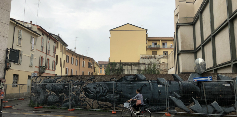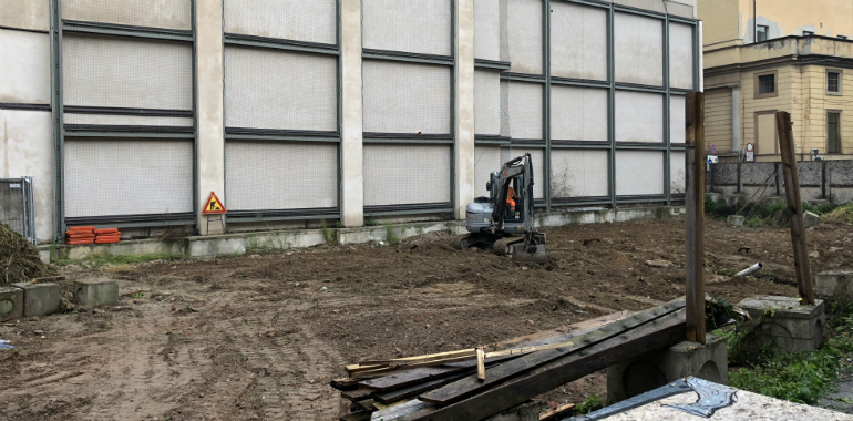 Prime immagini dell’area di via Goito senza palizzata, che venerdì aveva parzialmente ceduto rivelando quanto al suo interno si era accumulato, tra rifiuti e arbusti, in oltre 10 anni di abbandono, 16, da quando il cantiere per la mediateca si era fermato a causa dei danni provocati a palazzo Aschieri dalla demolizione del Supercinema. Lunedì i mezzi della ditta Sangalli, che ha vinto l’appalto per la sistemazione dell’area progettata dal Comune, sono entrati nello slargo facendo in pratica piazza pulita. E’ il primo passo concreto verso la riqualificazione di questa zona e la restituzione di uno spazio pubblico alla città. Uno spazio, ci tengono a precisare dall’amministrazione, che non sarà un giardino (poi sarebbe difficile la manutenzione) né tantomeno un parcheggio, come avrebbero voluto residenti e commercianti. Pavimentazione e progetto hanno ricevuto l’ok della Soprintendenza; per il murales sulla facciata dell’edificio di galleria Kennedy, il Comune ha affidato l’incarico di preparare un bozzetto al proprio centro Fumetto.