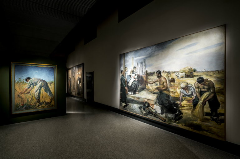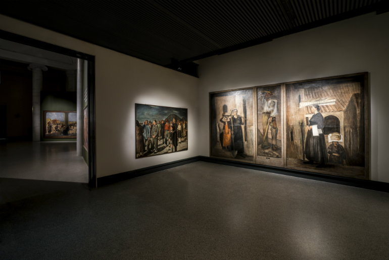 Inaugurata in Pinacoteca del museo civico la mostra Il Regime dell’Arte, rassegna che che ci accompagnerà fino al 24 febbraio 2019, curata da Rodolfo Bona e Vittorio Sgarbi. In mattinata, lo stesso Bona ha condotto una visita guidata per i giornalisti delle testate nazionali, mentre è in corso da mezzogiorno la conferenza stampa. L’allestimento presenta 30 delle oltre 300 tele di artisti più o meno noti, che parteciparono negli anni 1939 -1940 al concorso voluto da Farinacci nella sua città per esaltare i valori ideali del fascismo, al tempo stesso rifiutando quelle forme di avanguardia che anche il nazismo aveva marginalizzato come ‘arte malata’. Quindi: scena di vita nei campi, la mietitura, interni di famiglie intente ad ascoltare il discorso del duce, l’attività fisica delle colonie estive. Ma anche, ad una lettura più attenta, come quella che fa Bona del dipinto – simbolo della mostra, il piccolo ‘Balilla’ di Innocente Salvini, un velato dissenso verso l’omologazione culturale che traspare dalla pastosità del colore da cui è avvolto il bambino a piedi nudi e col braccio alzato, tanto da far passare in secondo piano il soggetto. Oppure, come fa Mario Biazzi nell'”Ascoltazione di un discorso del Duce alla radio”, volti emaciati che ci fissano senza espressione attorno a un tavolo vuoto, mentre a destra nell’angolo fa capolino la testa di Mussolini.