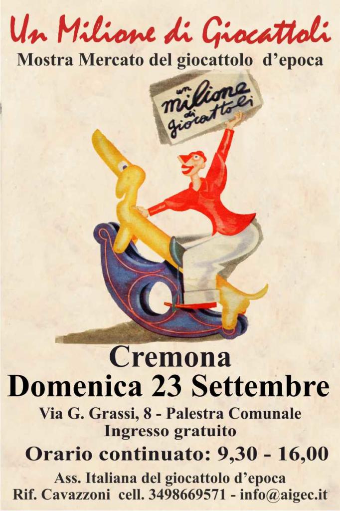 Domenica 23 Settembre a Cavatigozzi si terrà la 55esima edizione di ‘Un milione di giocattoli’, la mostra mercato del giocattolo d’epoca e da collezione. In questa edizione saranno presenti oltre 200 espositori italiani e stranieri. L’Associazione Italiana del giocattolo d’epoca, in collaborazione con le collezioniste Donatella Del Debbio ed Elisabetta Sgualdini, propone poi un’inedita esposizione delle bambole amiche Susanna, Sylvie, Sheila e Simona. L’ospite d’onore della manifestazione sarà il Prof. Ferdinando Superti Furga che, dicono gli organizzatori, “avremo il piacere e privilegio di conoscere”.