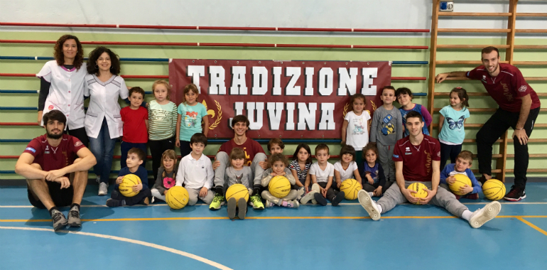 In occasione del progetto scuola realizzato in collaborazione tra la società Ju.vi Cremona Basket 1952 e la scuola per l’infanzia ‘San Giovanni’ di Castelvetro, i giocatori della prima squadra Matteo Dolzan, Alessandro Esposito e Andrea Sipala, accompagnati dall’istruttore minibasket e docente esperto Juvino Giulio Guernelli, hanno incontrato i bambini del gruppo ‘grandi’ e le loro insegnanti. “Giochi e divertimento hanno caratterizzato la lezione”, come sottolinea la società attraverso una nota: tante le sfide proposte, che hanno visto i bambini misurarsi con entusiasmo contro giocatori veri, che per un giorno “sono tornati bambini”.
