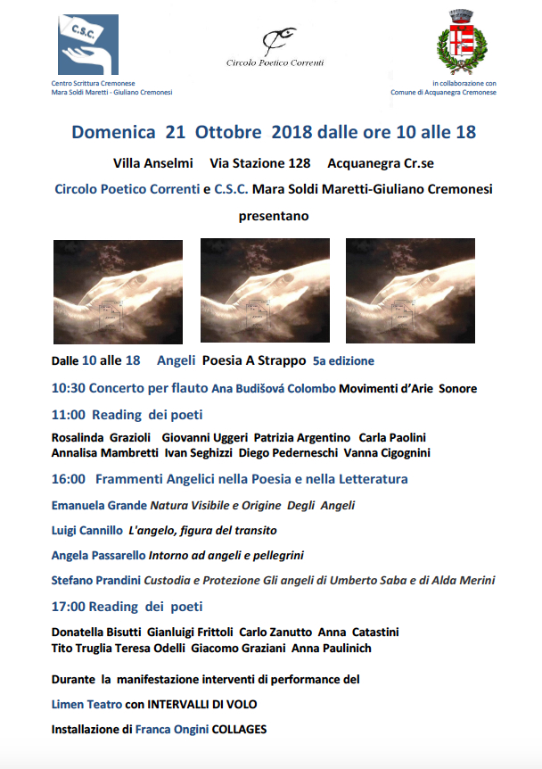 La manifestazione, nata a Crema nel 1995, è organizzata e prodotta dal Circolo Poetico Correnti che ne detiene il copyright ed in oltre vent’anni ha all’attivo un centinaio di manifestazioni.Dal 2003 è itinerante per le piazze ed i luoghi d’Italia sensibili alla poesia e giunge per la sua 5a edizione ad Acquanegra Cremonese. ’Poesia A Strappo – Angeli’ è organizzata dal Circolo Poetico Correnti con C.S.C.Mara Soldi Maretti-Giuliano Cremonesi in collaborazione con il Comune di Acquanegra. Tutti gli eventi, a partecipazione libera del pubblico e dei visitatori, si svolgono all’interno degli spazi espositivi della Villa Anselmi in Via Stazione 128 ad Acquanegra. La manifestazione è organizzata dal Circolo Poetico Correnti con’C.S.C. Mara Soldi Maretti-Giuliano Cremonesi’ in collaborazione con il Comune di Acquanegra. Per informazioni è possibile contattare Alberto Mori del Circolo Poeti Correnti (339 4469848, mementomor4@gmail.com) o Marina Grazioli di C.S.C. (338 3013244).