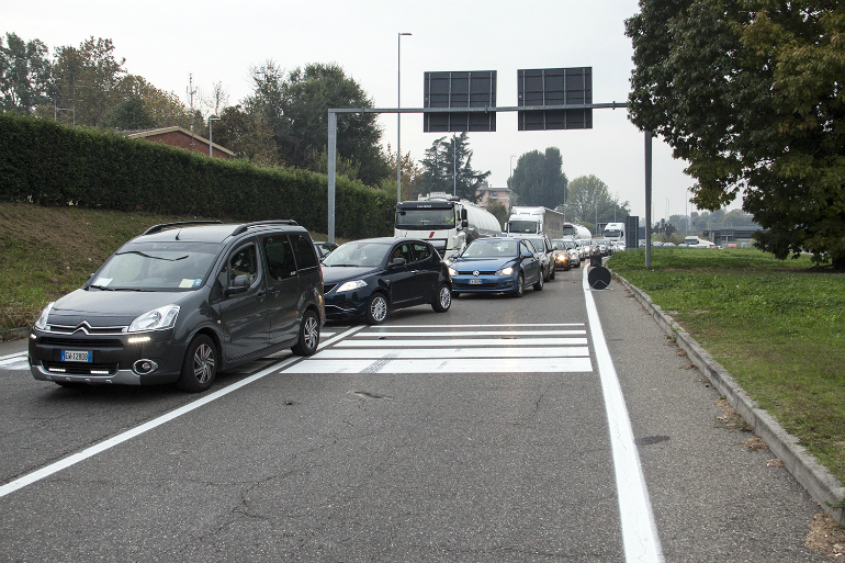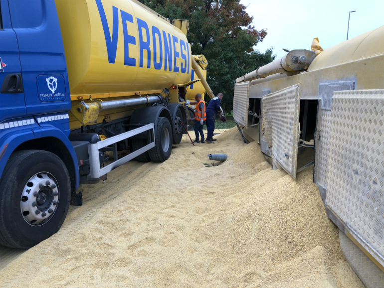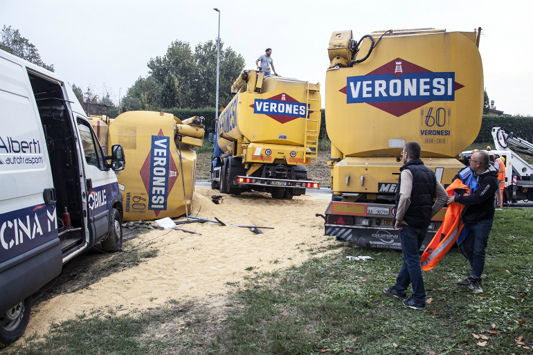 Camion si ribalta alla rotonda della Paullese: traffico congestionato e lunghe code