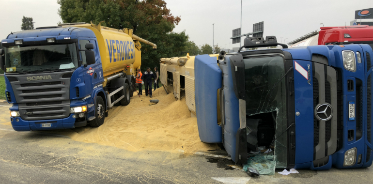 Camion si ribalta alla rotonda della Paullese: traffico congestionato e lunghe code