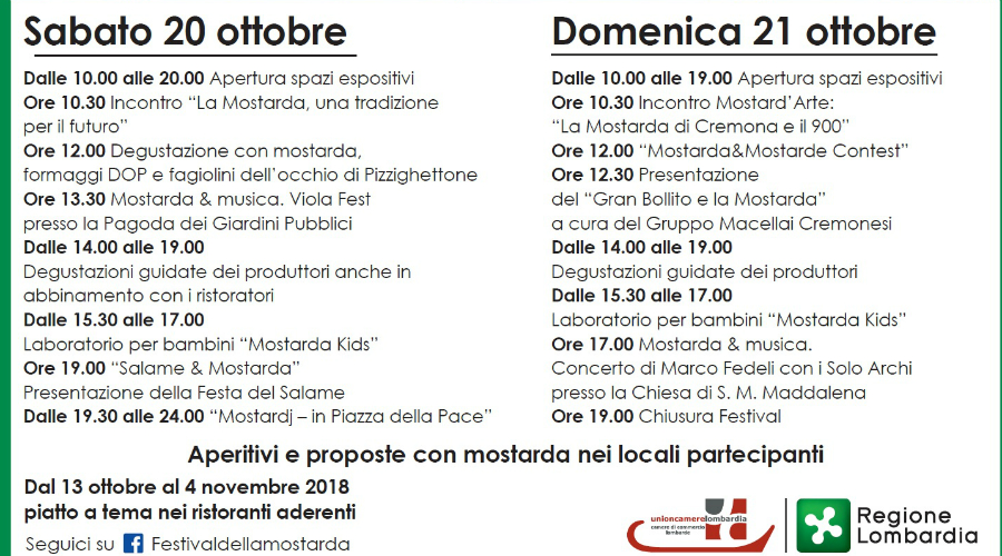 Incontri, degustazioni, talk show, laboratori per bambini ed eventi culturali con la partecipazione di chef, produttori e critici gastronomici si alterneranno per tutto sabato e domenica 20 e 21 ottobre, con degustazioni organizzate dai produttori di Mostarda, il sabato e la domenica pomeriggio e la partecipazione di alcuni chef del territorio. Sabato alle 19.00 inoltre, presentazione con degustazione della Festa del Salame con Stefano Pellicciardi di SGP Eventi e di Fabio Tambani, Presidente del Consorzio del Salame Cremona IGP, in programma il prossimo week end.