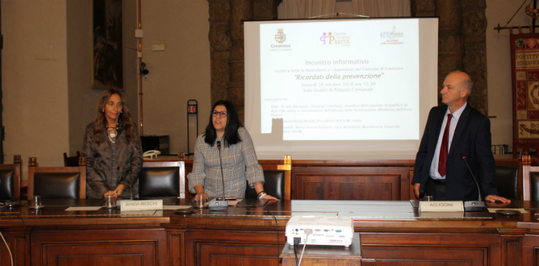 Nell’ambito delle attività svolte dal Centro Locale di Parità del Comune di Cremona, rivolte in particolare all’orientamento e all’informazione sui servizi territoriali dedicati alle donne e alle attività di prevenzione e promozione della loro salute e benessere, si è tenuto in mattinata, nella Sala Quadri di Palazzo Comunale, l’incontro formativo “Ricordati della prevenzione”.